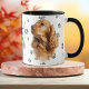This mug for the Cocker Spaniel owner features a beautiful portrait of a buff colored Cocker. The image is printed twice, and between them is an oval with the black text that says "Love my Cocker Spaniel". The oval and dog images are placed on a white background sprinkled with paw prints. Your monogram or name can be placed in a text field at the bottom.