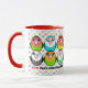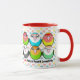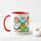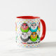 Un dibujo lindo del dibujo animado de los roseicollis del agapornis, también conocido como lovebird melocotón-hecho frente o atractivo-hecho frente. Seis pájaros con seis diversos colores del plumaje; Primer es un tipo salvaje color verde y los otros cinco son pájaros con mutaciones bien conocidas del color: el azul blanco-hecho frente (aguamarina), lutino, blanco-hizo frente a color de malva, a verde de mar verde y blanco-hecho frente naranja-hecho frente. Esta taza será un regalo atesorado para cada dueño melocotón-hecho frente del lovebird.