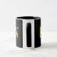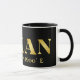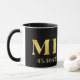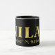Elegante taza de café muestra la ciudad de Milán, las coordenadas del mapa de latitud y longitud de Italia en fuentes doradas sobre fondo negro.