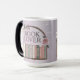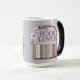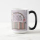 This Morphing Mug features a decorative books vector image with a soft pastel color palette. The image features the pink text BOOK LOVER outlined with black within a curved arch frame. The arch is adorned with white and pink flowers. Small pink cherry blossoms with green leaves are on the top of the arch. Below the text is a row of vintage-style books. The books have decorative spines featuring botanical patterns including floral designs, leaves and geometric shapes in muted pink, sage green and cream colors. The background is a soft lavender color. The bookshelf image is on both sides of the mug. The Morphing Mug shows the image when you put a hot drink in the mug. The mug is a fifteen ounce mug.