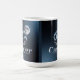 This Morphing Mug features a modern, stylized zodiac design with the Cancer astrological symbol in metallic silver and blue colors on a blue gradient background. The symbol is in a glossy style with curved lines forming the crab shape. Above the symbol is a full moon with lunar surface texture in the upper right portion of the image. The moon is in white with shadow details showing its crater patterns. Below the symbol is the word Cancer in sleek, metallic silver text like the symbol above. The mug is a white fifteen ounce Morphing Mug. When you put a hot drink in the mug the image appears. The Cancer image is on both sides of the mug.