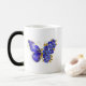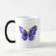 Joyería, azul, zafiro, mariposa floral brillante con ala decorada con flores azules y preciosas con hojas de oro sobre fondo blanco.