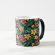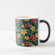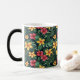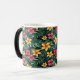 Flor tropical Hibiscus Seamless Pattern Magic Mug. Patrón de flores tropicales sin soldadura con hibisco rojo y amarillo con fondo de hojas tropicales,