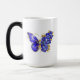 Jewelry, blue, sapphire, sparkling flower butterfly with wing decorated with blue, precious flowers with gold leaves on white background.