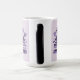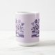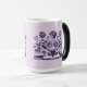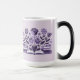 This Morphing Mug displays a stylized illustration of a book with flowers in a purple and lavender color scheme. The central focus is an open book with white pages, positioned horizontally across the bottom of the image. Above the book, a bouquet of flowers spreads outward, featuring a large purple rose in the center, with smaller purple and lavender flowers including tulips, daisies and star-shaped blooms. The flowers have detailed petals and leaves in various shades of purple to light lavender. The illustration is set against a light lavender background. This mug is a Book Lovers Mug. The morphing mug shows the books and flowers image when you put a hot drink in the mug. The image is on both sides of the mug. The mug is a fifteen ounce morphing mug.