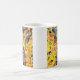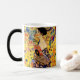 Magic Mug presenta la pintura al óleo de Gustav Klimt Lady with Fan (1918). Una mujer con un kimono azul sostiene un ventilador rojo contra un colorido fondo amarillo de flores y pavos reales. Un gran regalo para los amantes del arte japonés y europeo.