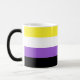 Las personas no binarias pueden identificar que tienen dos o más géneros; sin género; el desplazamiento entre los géneros o la existencia de una identidad de género fluctuante; o ser de tercer género u otro género, una categoría que incluye a aquellos que no le dan nombre a su género. Cada color de banda representa diferentes tipos de identidades no binarias: Amarillo para las personas que se identifican fuera del binario de género, blanco para las personas no binarias con múltiples géneros, morado para las personas con una mezcla de género masculino y femenino, y negro para los individuos de género.