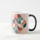 This Morphing Mug features a geometric art piece featuring overlapping circles and curved shapes in a symmetrical pattern. The color palette consists of coral pink, teal blue, navy blue, cream white and light salmon tones. The design is arranged in a four-pointed star formation, with curved shapes creating a balanced composition on a beige background. The shapes are arranged in a way that creates negative space and visual flow, with some circles partially overlapping others. The curved segments are arranged in a continuous, flowing pattern that creates a modern, abstract aesthetic. The image is on both sides of the mug. When you put a hot drink in the mug the image will appear.