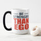 Este diseño de la taza incluye una frase motivacional, "SER MÁS FUERTE QUE EGO", que se muestra en negrita y en mayúsculas. La disposición del texto utiliza dos colores para enfatizar: las palabras "BE STRONGER" están en un color azul marino oscuro, mientras que "THAN EGO" está en rojo brillante. La tipografía es audaz y angustiada, dándole una apariencia accidentada e impactante. Las sutiles líneas horizontales por encima y por debajo de "BE STRONGER" agregan equilibrio y estructura al diseño. Este estilo seduciría a quienes buscan una estética minimalista y empoderadora.