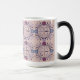 This Morphing Mug features a symmetrical retro-style pattern design on a pink background. The pattern consists of four identical quadrants arranged in a 2x2 grid. Each quadrant features a geometric flower-like motif with a circular center with radiating blue-gray and purple petals. The petals are arranged in a starburst pattern with 8 points, each point extending outward with smaller curved segments. Small black dots connect the points of each flower pattern. The color palette includes purple, lavender, pink and light blue. The pattern has a modern, abstract aesthetic. The geometric image is on both sides of the mug. The Morphing Mug displays the image when you put a hot drink in the mug. The mug is an eleven ounce mug. This mug meets the FDA requirements for food and beverage safety.