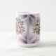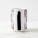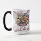 This Morphing Mug features a decorative zodiac design with the Libra Glyph centered in an elegant floral arrangement. The Libra symbol is in metallic rose gold. The floral bouquet contains large peonies in beige, silver and dusty rose colors, with a burgundy rose and a magenta flower bud. The arrangement includes delicate green eucalyptus leaves, golden fern fronds and small burgundy accent flowers. The flowers are painted in a watercolor style with subtle color variations. The word LIBRA appears at the bottom of the design in large, elegant rose gold capital letters with a subtle gradient effect. The pretty image is on both sides of the mug. You can see the image after you put a hot drink in the mug.