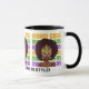 Elegante MARDI personalizado GRAS Afro Queen Coffee Mug con TEXTO PERSONALIZABLE. El diseño muestra a una Reina Africana usando una máscara de máscaras de Mardi Gras y pendientes. La frase MARDI GRAS se repite en los colores populares del morado, el oro y el verde en el fondo en tipografía audaz. Regalo ideal del Mardi Gras para celebrar el Martes de Grasa en Luisiana, Brasil y donde sea que se celebre el Mardi Gras. Ropa de juego y regalos disponibles.