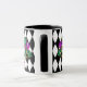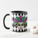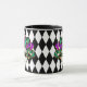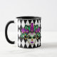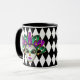 Esta combinación de tazas blancas y negras tiene una imagen de una máscara festiva de Mardi Gras sobre un patrón de diamante blanco y negro. Personalizar este artículo o compre como está diseñado.