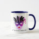Esta combinación azul profundo y blanco tiene una imagen de máscaras de Mardi Gras sobre pequeñas estrellas de color dorado en un fondo blanco. El texto de "Dejar que los buenos tiempos se vuelvan' está debajo de la máscara en Cada lado de la taza. Personalizar este artículo o compre como está diseñado. Colores: mango azul profundo e interior, fondo blanco, estrellas doradas y una colorida impresión de violetas, máscaras rojas y negras. Imágenes y texto impresos.