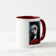 Retrato de una mujer con el cráneo del azúcar del maquillaje muerto con rosas rojas en un fondo de gris azul