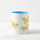 Una taza blanca con un borde y mango azul y un delicado diseño pintado de mariposas naranjas.