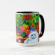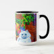 Coffee Mug con el maestro de pintura animal de Louis Wain del Cat College (1860-1939). Un bonito gato blanco con ojos azules llamativos se sienta preponderantemente al lado de una vibrante variedad de hermosas flores. La majestuosa escuela de gatos se cierne sobre el fondo bajo un cielo rosa y azul. Un regalo maravilloso para los amantes de los gatos y el arte inglés.