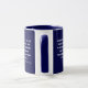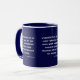 Esta taza de dos tonos muestra un tipo de letra de impresión riótica con letras azul marino que muestra el versículo de la escritura bibliográfica KJV "Matthew 19:6" sobre un fondo azul marino. Este verso hace referencia al capítulo 19 del Libro de Mateo que muestra el sexto verso de esta escritura biblia, el tema de la cita de la Biblia del Rey James. La llanta y la manecilla están acristaladas con colores a juego disponibles en la construcción de cerámica de microondas y lavavajillas de 11 onzas o 15 onzas.