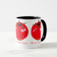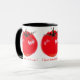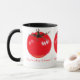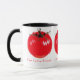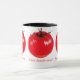 Este Mug presenta un diseño original con tres tomates rojos brillantes seguidos en la parte superior, y la frase "¡Me encanta la sopa de tomate!" debajo de las fotos, en tres idiomas: francés, inglés y español. El tomate de la foto parece "electrificado", con el tallo verde y hojas hechas de líneas de zigzag, y una línea de zigzag blanco resalta en la brillante piel roja de tomate. Estos tomates son calientes rojos, y esta taza es genial para sopa de tomate.