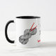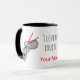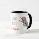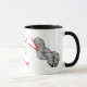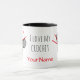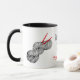 Añade tu propio nombre a esta taza, está decorada con manchas blancas y negras de lana, cada una con dos ganchos rojos de crochet y las palabras "amo a mi crochet"