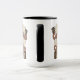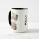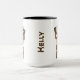 Diseño humorístico para programadores o programadores. Dos tazas de café "para ir" en la parte superior con las palabras "Medio café, medio coder" escritas en un divertido tipo marrón y beige con un ilustracion de teclado en la parte inferior. El diseño está a ambos lados de la taza, con un lugar en el medio para personalizar con un nombre. Disponible en varios tamaños y mango de barro y colores interiores, incluyendo el blanco.