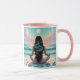Hermosa obra de arte que representa a una magnífica mujer meditando en la playa con una pina y nubes azules, olas del océano, arena blanca y cristal.
