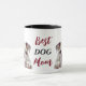 "Best DOG Mom" declara esta linda taza en el centro. La imagen de cada lado es una imagen adorable de un Bulldog marrón y blanco. ¡Perfecto para el Día de la Madre o su cumpleaños! Todo el texto es personalizable, así que puedes cambiarlo por papá en el Día del Padre también.