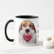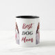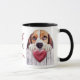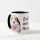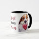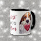 "La MEJOR MAMÁ DE PERRO" declara esta taza en el centro. La imagen en cada lado es de un adorable Beagle asomándose sobre una cerca de madera y ofreciendo un corazón rojo brillante. Perfecto para el Día de la Madre o su cumpleaños. Todo el texto es personalizable, así que también puedes cambiarlo para Papá en el Día del Padre.