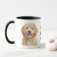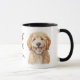 "Mejor Mamá PERRO" declara esta taza adorable en el centro. La imagen a cada lado es una adorable imagen de un Goldendoodle rubio. ¡Perfecto para el Día de la Madre o su cumpleaños! Todo el texto es personalizable, así que también puedes cambiarlo para Papá en el Día del Padre.
