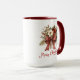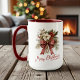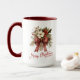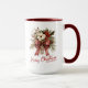 Merry Christmas Elegant Floral Personalized Name Holiday Coffee Mug features the text "Merry Christmas" in modern red calligraphy script typography accented with a bouquet of watercolor winter flowers with a plaid bow and personalized with your custom name below. Perfect for Christmas gifts, Christmas parties and holiday celebrations, birthdays and more. Created by Evco Studio www.zazzle.com/store/evcostudio