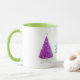 This coffee or tea mug has two sparkle like dark pink Christmas trees decorated with shiny silver stars sitting on star shaped rugs with the text Merry Christmas in bold fancy letters with yellow stars.