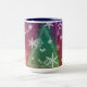 Una dispersión de copos blancos de nieve, hojas y bayas huecas, estrellas y pinos sobre un fondo brillante de rojo, naranja, oro y morado, con una suave forma verde de árbol de Navidad en el medio.