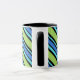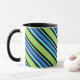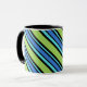 Una taza de moda Ringer Mug con un patrón de lunas azules a rayas de las tumbonas en turquesa, verde neón, azul brillante y negro. Parte de la colección "Blue Moons" de Posh & Painterly.