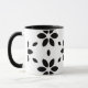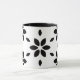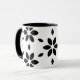 A chic black and white abstract floral print features elegant black flower petal shapes on a crisp white background.