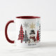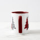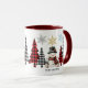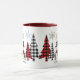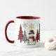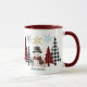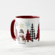 Modern "Merry Christmas" Coffee Mug featuring Traditional patterned plaid Christmas trees, Gold silver and ice blue snowflakes with a Cute little snowman wearing a black and red plaid scarf.
