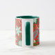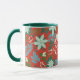 Esta hermosa taza de Navidades presenta elementos florales dibujados a mano en varios tonos de verde, menta, verde azulado, blanco roto. Incluyen pino, flores, brotes, hojas, bayas junto con letras modernas a mano en blanco roto, que dicen, "Feliz Navidad". El color de fondo es un Navidad tradicional, clásico rojo.Pintura original de Caroline Bonne Müller