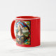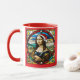 A funny Christmas mug featuring the Mona Lisa wearing a Santa hat portrayed in stained glass.