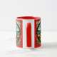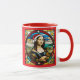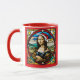 Una divertida taza de Navidad con la Mona Lisa llevando un sombrero de Santa representado en vidrio pintado.