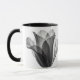 A close-up, monochrome photograph showcases a tulip flower against a bright white background. The flower's petals are delicately rendered, with visible veins adding texture. The image captures the flower from a low angle, emphasizing its upward reach. The stem is slender and dark, contrasting with the lighter petals. The overall mood is serene and elegant, highlighting the flower's natural beauty.