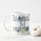 ¡Te encantará mostrar esta taza de café personalizada de bonito por la oficina! Presenta un patrón de hojas azul y verde índigo e imágenes de helecho haciendo un borde para su monograma en el centro. El monograma y las imágenes se colocan sobre un fondo blanco y se repiten al otro lado de la taza.