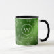 Añada un toque festivo a las celebraciones de fin de año y Navidades con esta elegante taza, que presenta copos de nieve cayendo sobre un falso Relieve metalizado metálico verde del bosque / fondo sombrío / moire. Añada el texto inicial/monograma (o logotipo), nombre, año o personalizado que desee. Diseño © W.H. Sim. Ver más en zazzle.com/expressionsoccasions