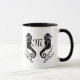 Dos caballitos de mar en forma serpentina, se realizan en forma de silueta. En la base del caballito de mar hay algas. Entre el caballo está la letra "M", la m es corta para el monograma y puede cambiarse.