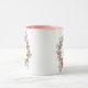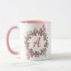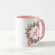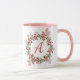 Esta es una elegante taza de monograma con una corona con bayas de Navidad y hojas en tonos rosas y verdes. La carta dentro de la taza es personalizable con la carta del destinatario.