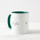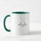 Una taza verde monogramada con el nombre y la inicial del jugador de golf, y con la imagen de dos clubs de golf cruzados