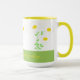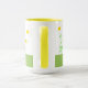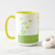 tazón de café amarillo de diseño, acentuado con verduras, con una fresca huella de margarita blanca. El texto se puede personalizar a su propio mensaje inspirador, o el texto es extraíble. Hermosa idea de regalo personalizado personalizada.
