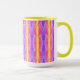Tejidos en tonos pastel vivos (rosa, azul, amarillo). El patrón Kaleidoscópico se asemeja a la piel de serpiente, con sus formas de chevron convergentes. El amarillo brillante divide el patrón en tiras.