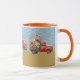 Mug con camiones rojos y flores en un cielo de colmena y una plataforma de bronceado. Gracias a Creative Fabrica por algunos de los elementos del diseño.
