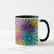 Esta taza tiene un diseño Bauhaus de una mezcla de flores en rosa, púrpura, azul y amarillo en un campo de verde.