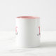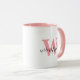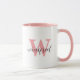 El diseño moderno de un monograma en una tipografía audaz del serif está en una capa bajo un nombre en un tipo de letra manuscrita. El mismo diseño aparece automáticamente en ambos lados cuando se personaliza. Puede cambiar el color rosado si lo desea. Excelente regalo para vacaciones, eventos de café de trabajo, fiestas de boda y más!