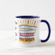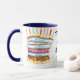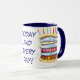Una taza de ringer blanca de buena calidad con llanta y mango azul oscuro. El diseño pintado a mano es un pastel para el Día del Padre y un recordatorio de que todos los días es el 'Día del Padre'. Vea también la tarjeta de felicitación y la vestimenta correspondientes. Lavavajillas y caja fuerte con microondas.